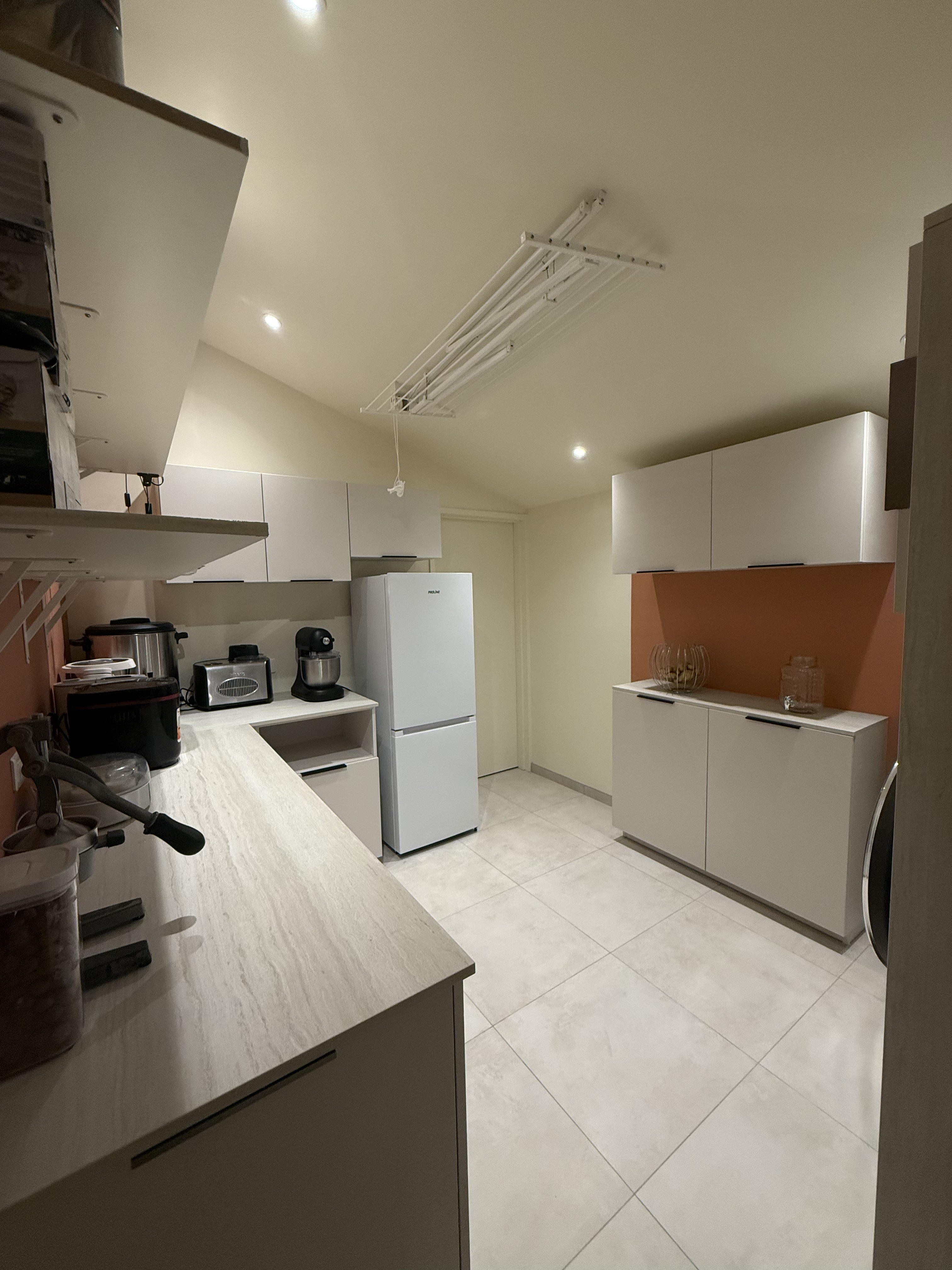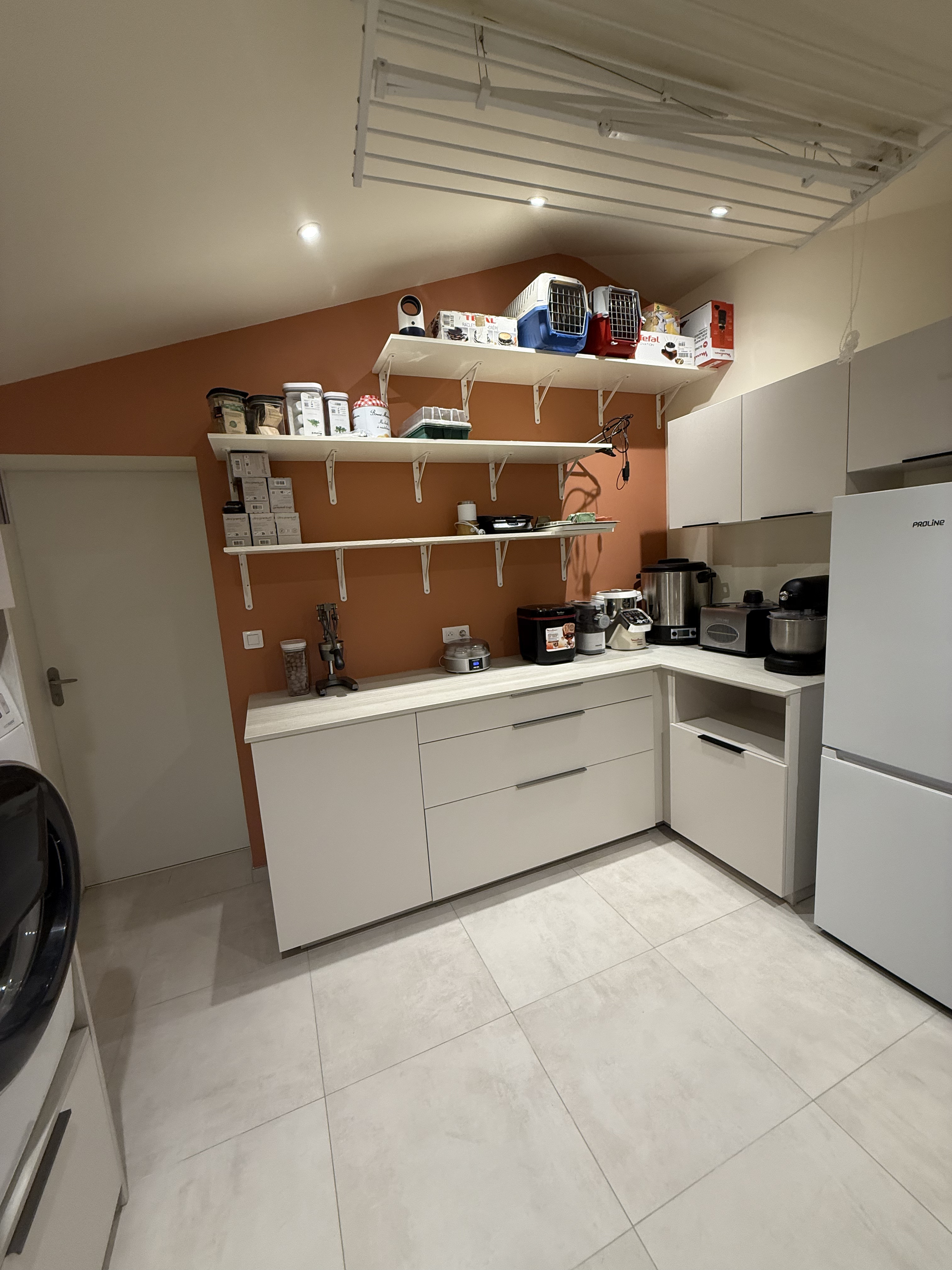 mobilier : pose de mobilier de buanderie, pose d'un étendoir au plafond, découpe et pose d'étagères murales