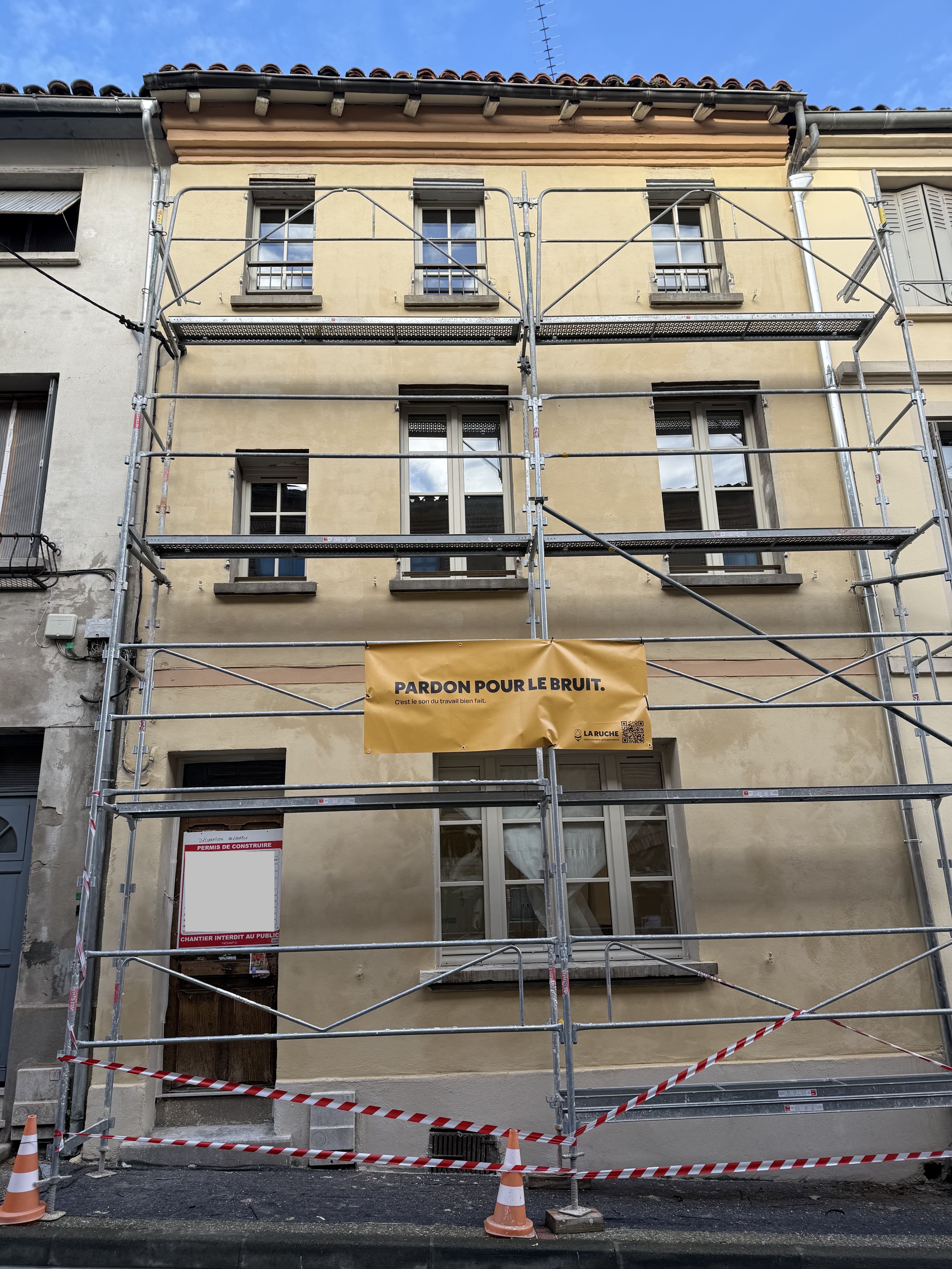 Prépa façade : piquage des parties endommagées, pose d'un grillage rénovation fixé avec crampillons en acier galvanisé, lavage haute pression, rebouchages et reprise des éléments abimés au sous-enduit à la chaux et appuis de fenêtres